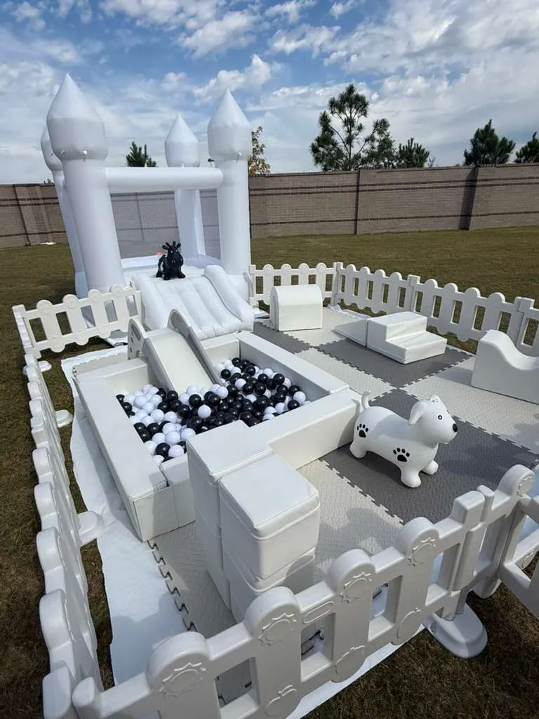 A safe & fun enclosed play area for babies and toddlers. Includes ball pit, mini slide, climbing blocks, soft mats (10x10 area), ride-on toys, safety fence, and a bounce house (8x8 ft) — ideal for indoor areas or shade (for safety).